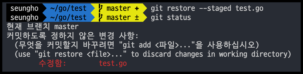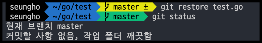 unstaged 상태로 만들었으니, git restore 명령어로 수정한 작업 자체도 되돌리겠습니다. (이전 커밋 상태로 test.go 파일 내용을 롤백)