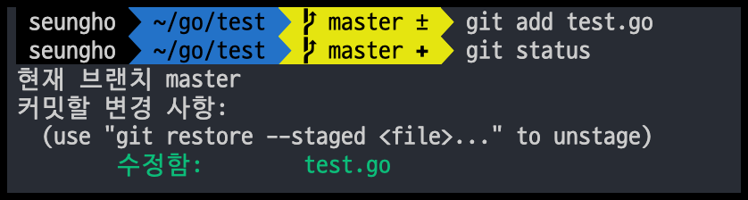 이제 test.go에 새로운 기능을 넣었다 가정하고(파일 수정), 다시 git add 명령어를 통해 staged 상태로 만들자어볼까요?