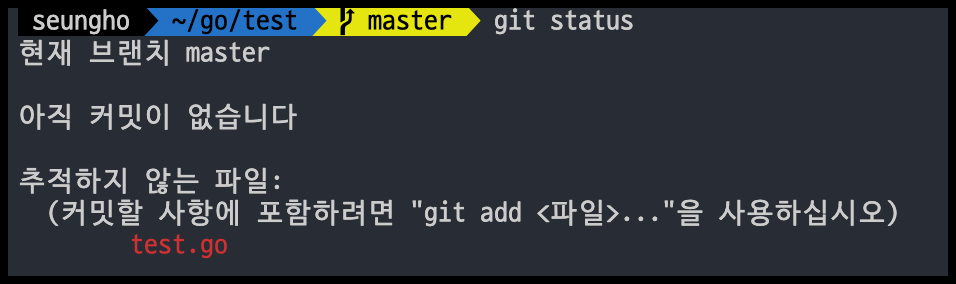 그런 다음 test.go 파일을 스테이징(staged 상태) 하기 위해 git add 명령어를 사용합니다.