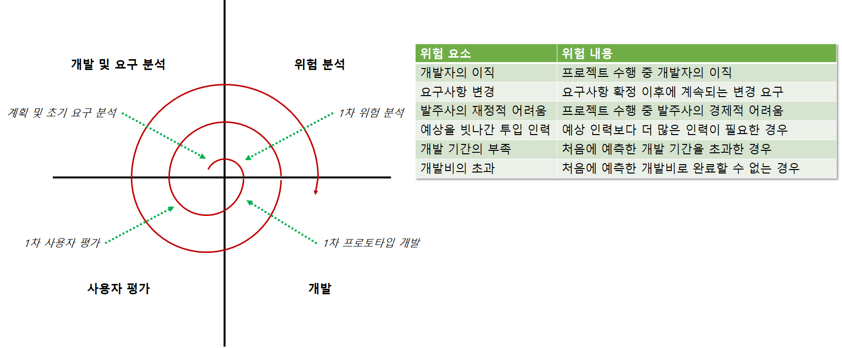 이 모델은 프로토타입 모델에서 위험 분석을 추가한 모델이다. (프로토타입 모델 + 위험 분석)