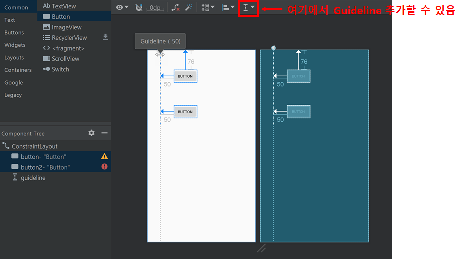 하나의 기준점을 두고 거기에 맞춰 배치할 수도 있다. Guideline 선을 하나 두고 버튼 2개를 이 선에 연결시켜 배치한다.