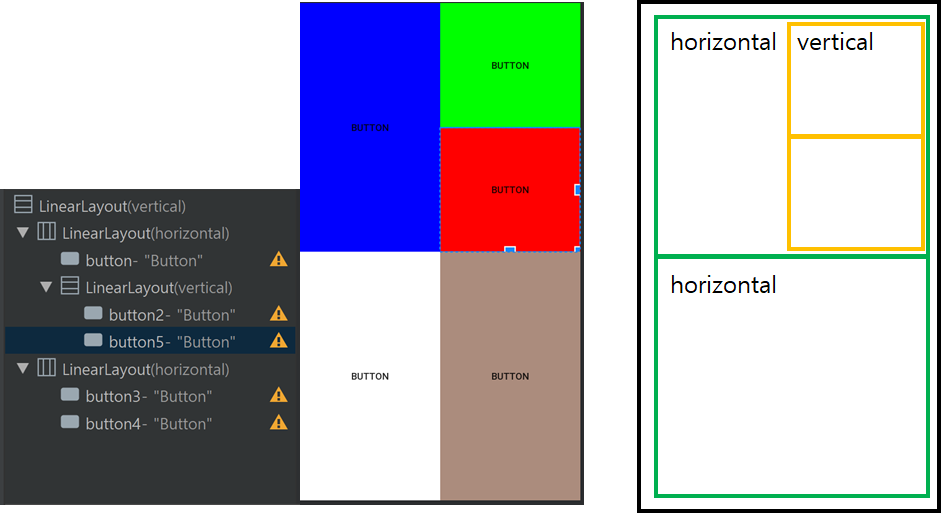 리니어 레이아웃은 가장 직관적인 방법입니다. Vertical(수직), Horizontal(수평) 2가지 방향의 리니어 레이아웃이 있고, 리니어 레이아웃 안에 리니어 레이아웃을 중첩시킴으로써 좀 더 복잡한 화면을 만들 수 있다. 아래 그림은 내가 임의로 중첩시켜 만들어봤는데 좌측에 리니어 레이아웃이 어떤 식으로 중첩되어 있는지 나타나있다.