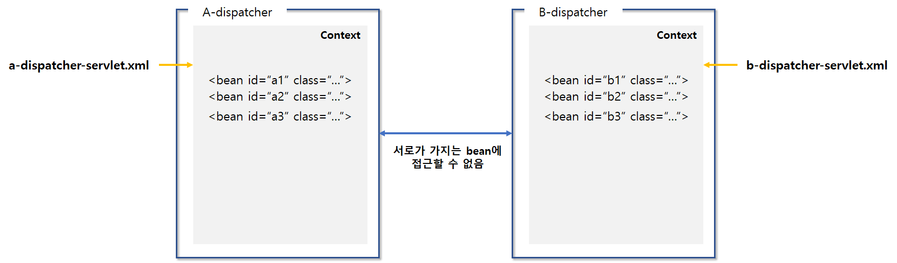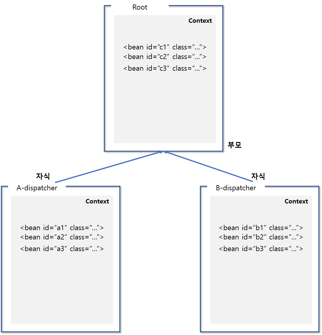 A-dispatcher(이하 A)는 a-dispatcher-servlet.xml 파일을 가지고 자신의 Context를 만들 것이고,