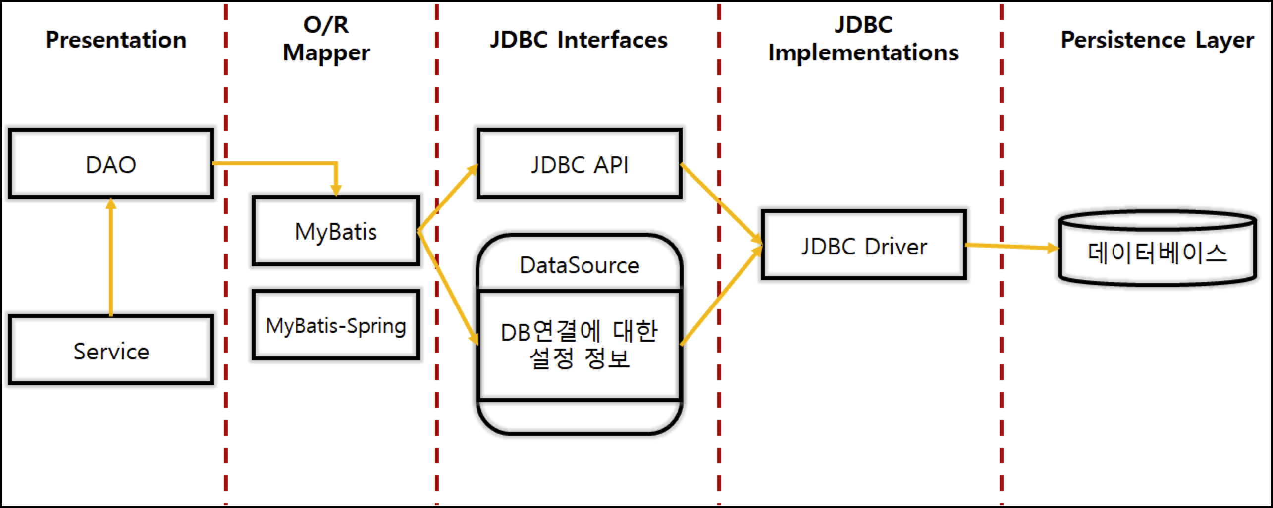 아래 보시는거처럼 MyBatis는 DAO와 JDBC 사이에 위치하여 서로를 매핑해줍니다.