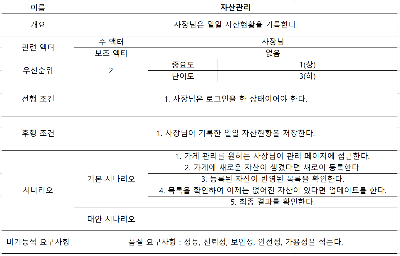 자산 관리라는 임의의 기능으로 간단한 명세서를 만들어보자.