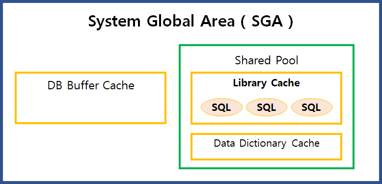 옵티마이저가 SQL 파싱, 최적화, Row 소스 생성 과정을 거쳐 생성한 SP를 반복 재사용할 수 있도록 캐싱해두는 메모리 공간이 라이브러리 캐시입니다. 사용자가 SQL문을 전달하면 DB는 동일한 SQL문이 라이브러리 캐시에 존재하는지부터 확인합니다.