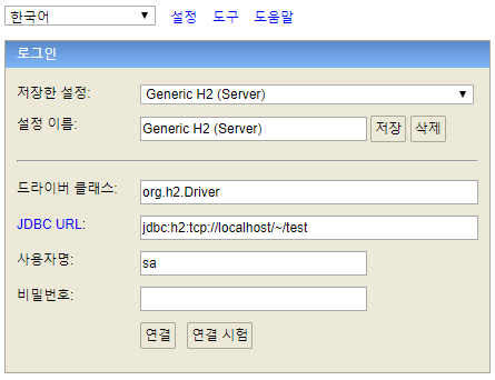 JDBC URL : jdbc:h2:~/test 로 수정한 후, [연결] 버튼을 누른다.