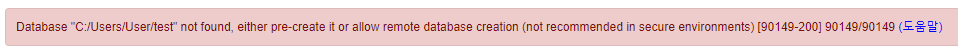 여기서 기본 값으로 놔두고 [연결] 버튼을 누르면 홈 디렉터리에 'test' DB를 자동으로 만들어줄거라 생각했지만,
