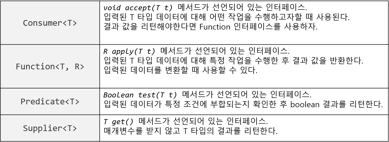 해당 패키지에서 대표적으로 사용되는 Functional Interface는 네 가지다.