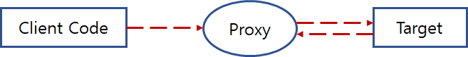 클라이언트 코드가 타겟을 호출하면 Proxy 객체가 대신 요청을 대신 받아 선처리-타겟 메서드 실행-후처리 순으로 실행합니다.