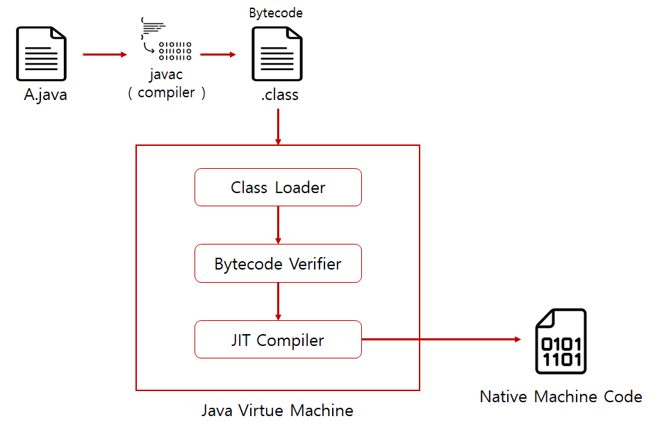 - .java 파일은 javac( java compiler )를 통해 바이트 코드를 가진 .class 파일로 변환된다.