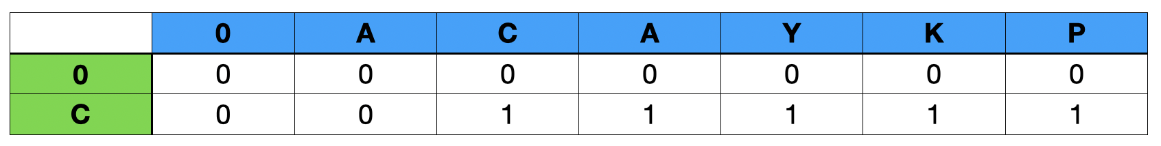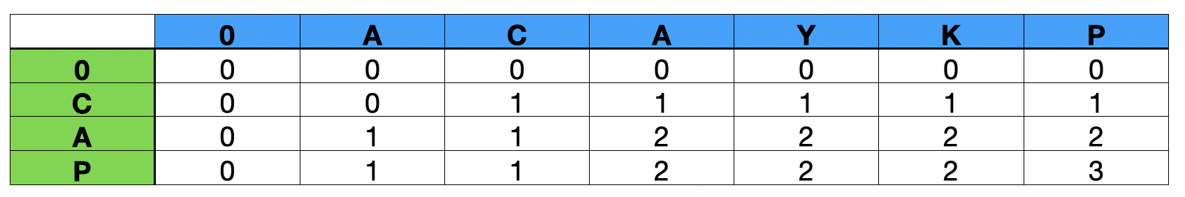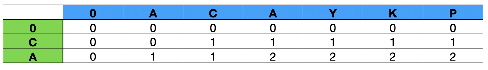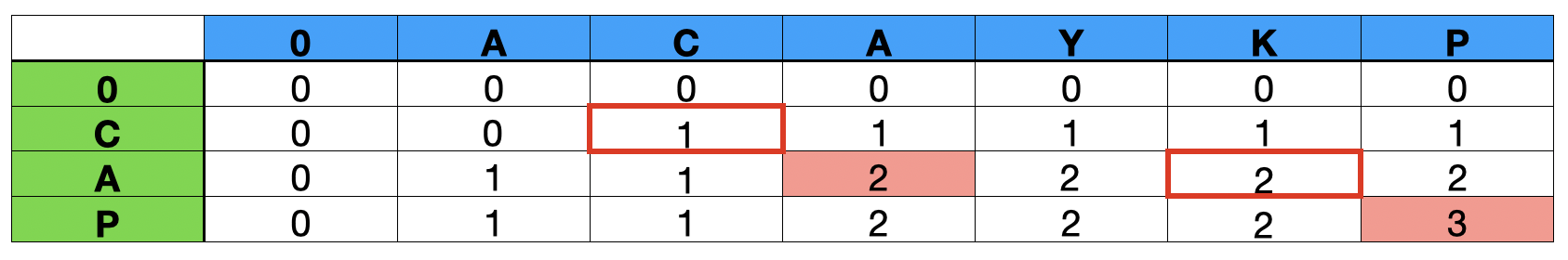 먼저, 2로 채워진 셀을 보면 ACA와 CA를 비교하는데 가장 마지막 문자인 'A'가 같다. 즉 두 문자열의 LCS는 최소 1이다.