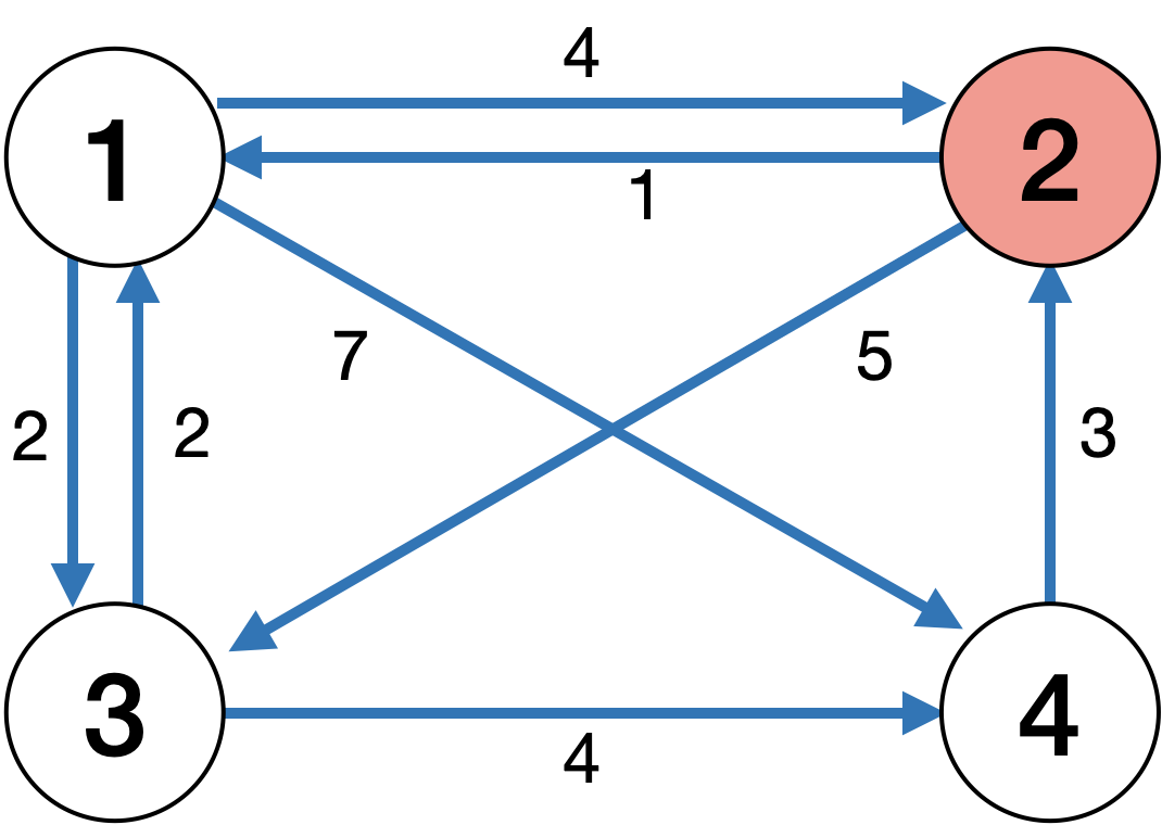 생각해볼 경우는 첫 번째 경우인데, 2번 노드를 목적지로 생각하게 되면 1, 3, 4번 노드 각각에 모두 다익스트라를 사용해야 한다.