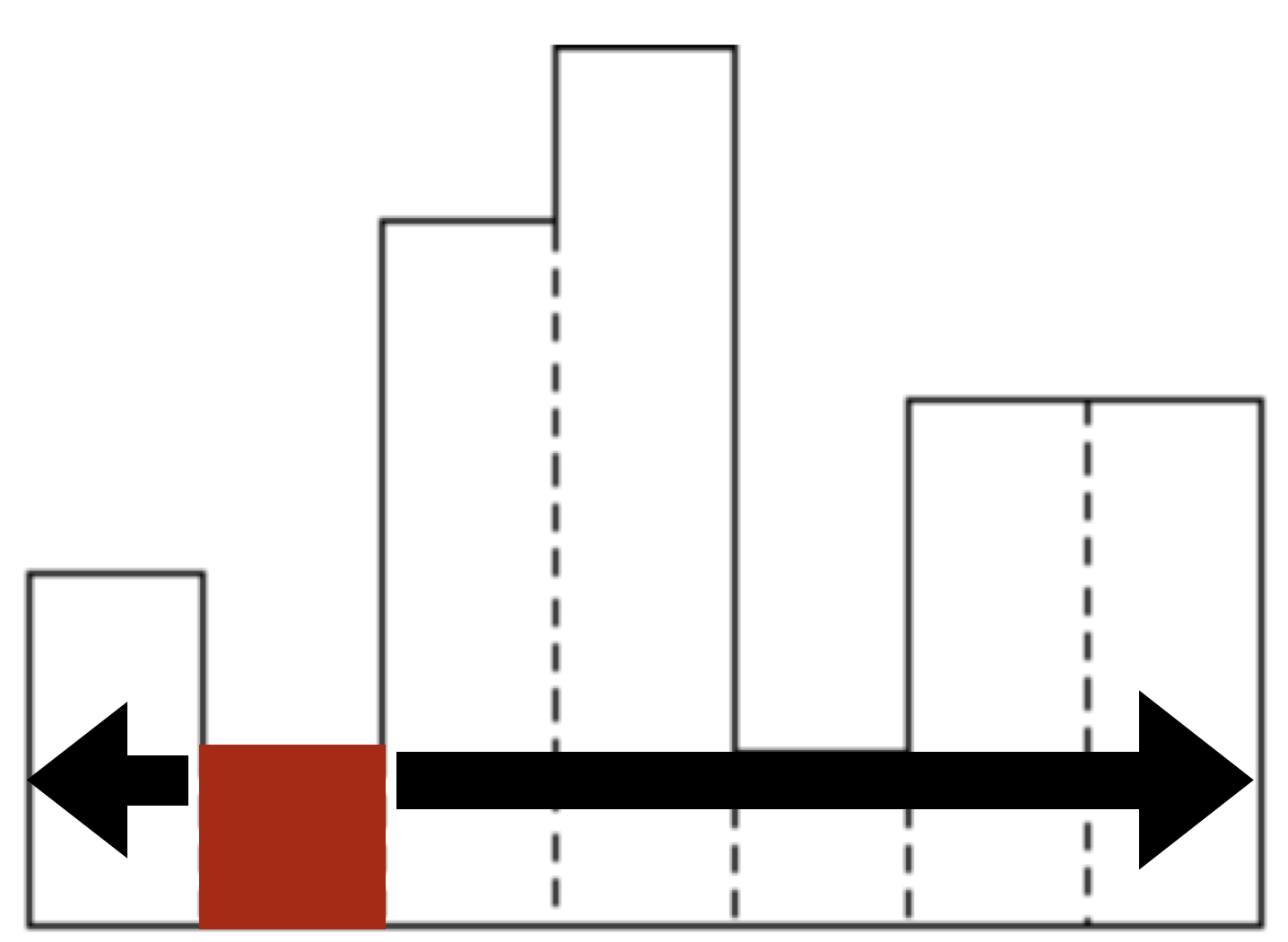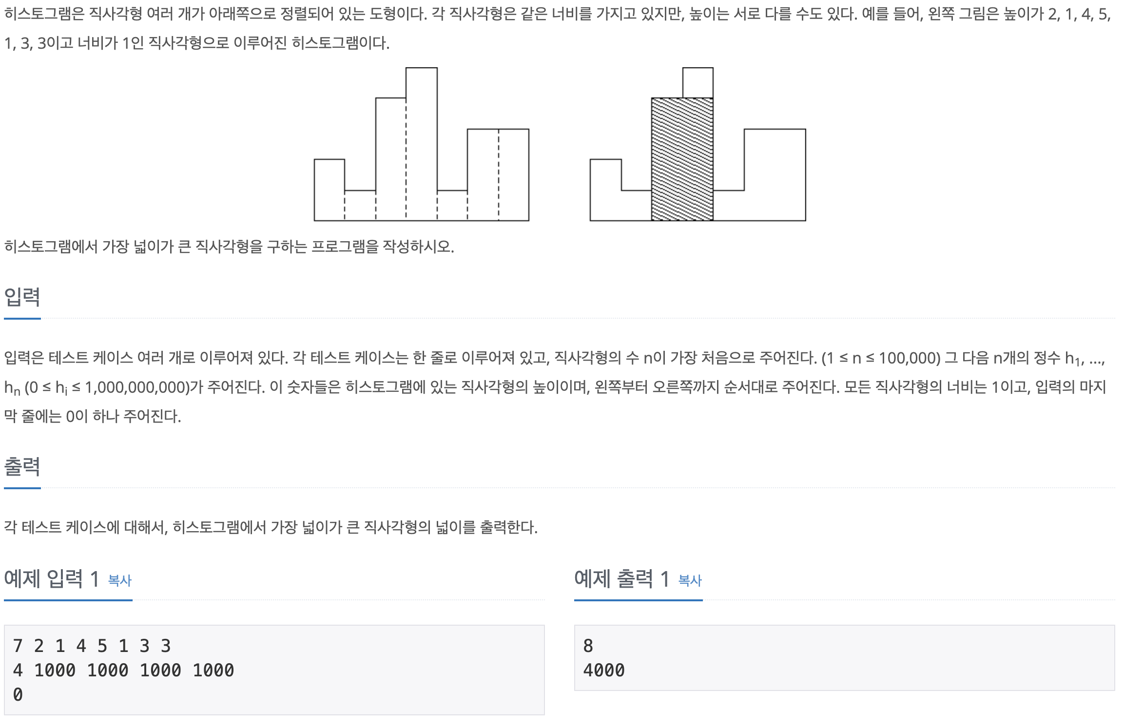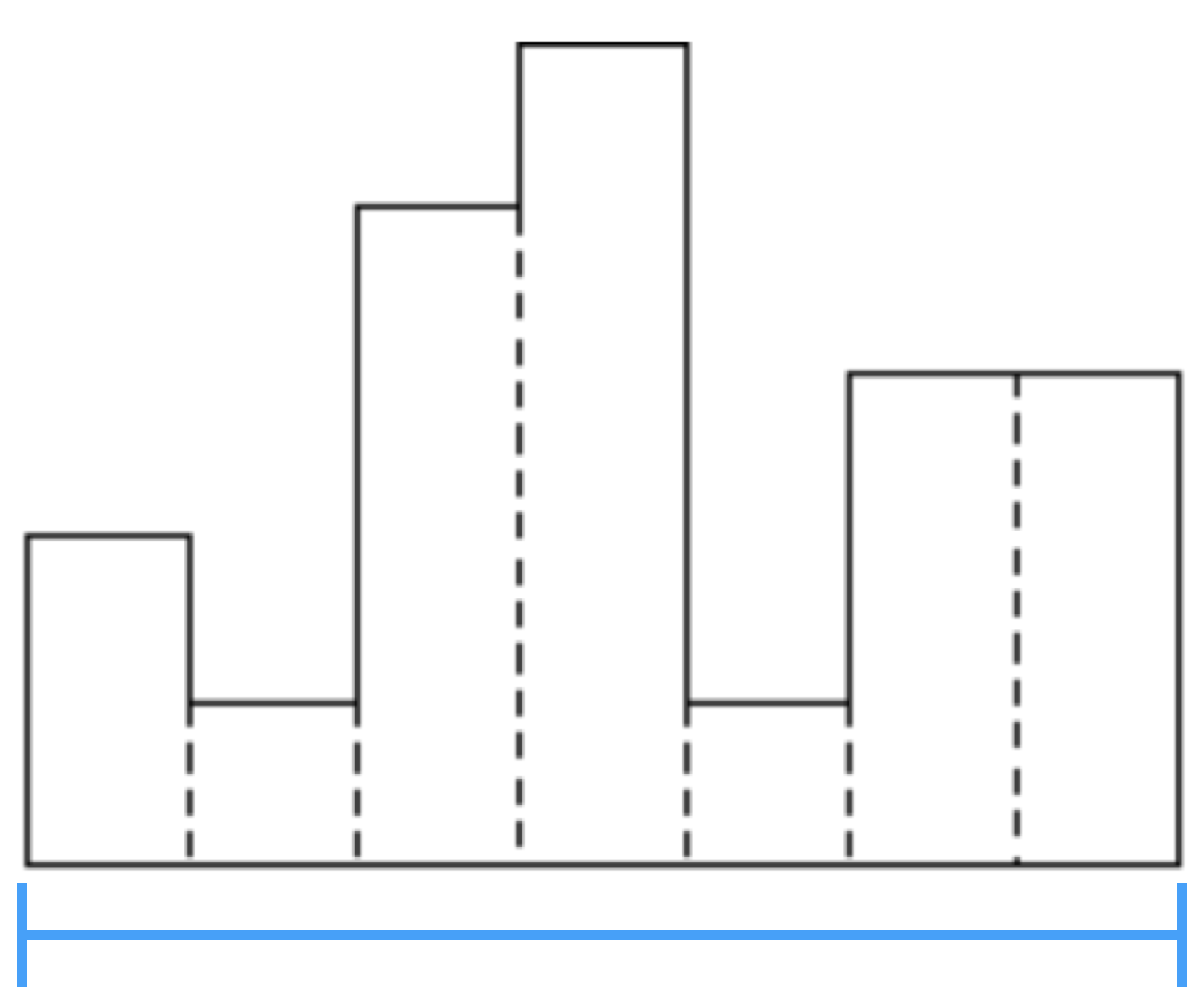 위 그림처럼 최소 높이를 가지는 위치를 기준으로 좌측과 우측에 대해 분할정복을 수행하여 최대 넓이를 찾는다.