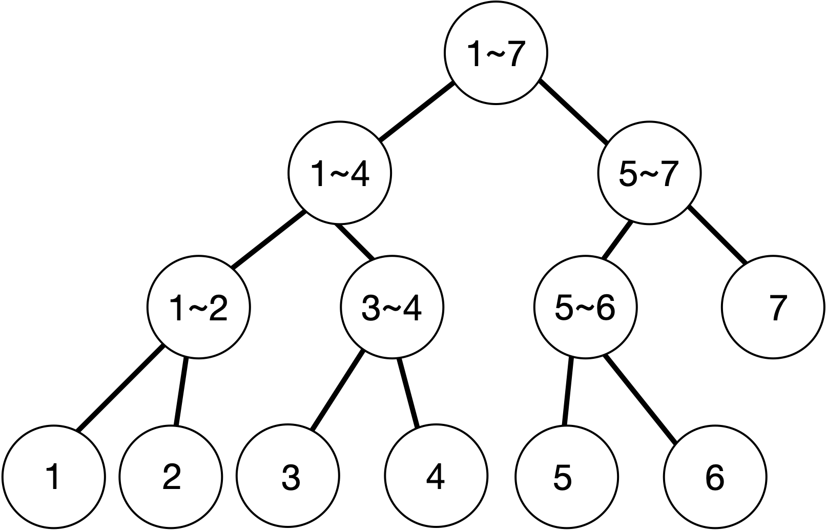 먼저, N=7의 길이를 가지는 수열에 대해 각 세그먼트 트리의 노드에 저장될 구간은 다음과 같다.