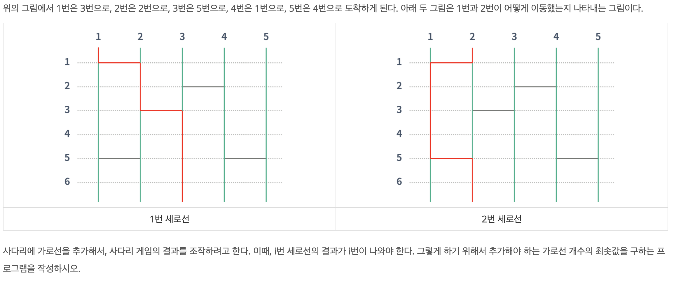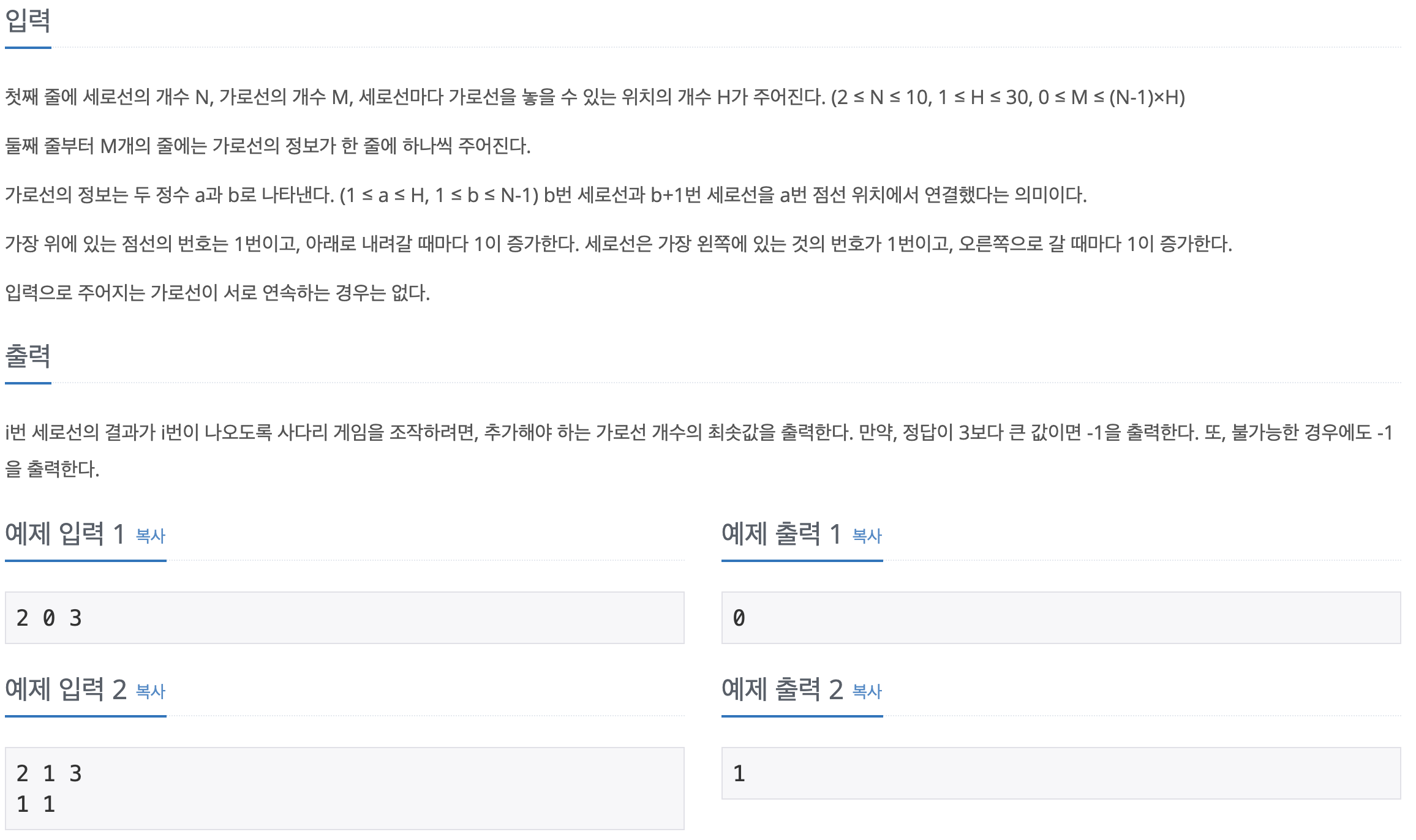 // 추가할 가로선의 갯수를 미리 정해놔야 탐색 종료 조건으로 걸 수 있다.
