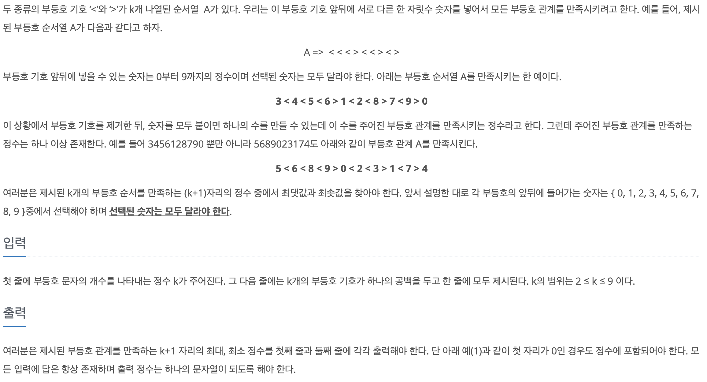 0~9의 고정된 수열이 있고, 주어진 부등호 조건을 만족하는 수열을 찾으면 된다.