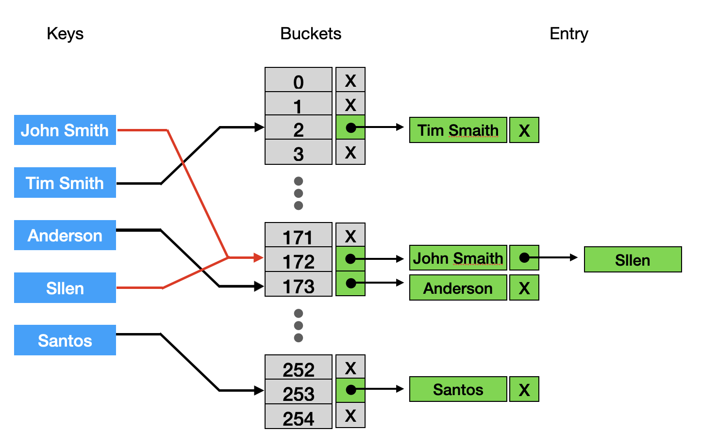 쉽게 말해, 각각의 버킷에 여러 데이터가 저장될 수 있으니, 하나의 버킷 자체도 배열로 구성하는 것이죠.
