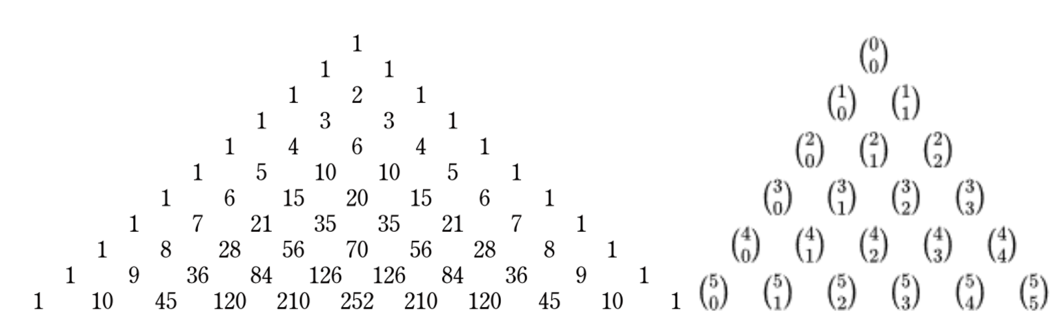 이항 계수를 식으로 표현 ---> $n \choose k$ = $\frac{n!}{k!(n-k)!}$ = ${}_n \mathrm{ C }_k$
