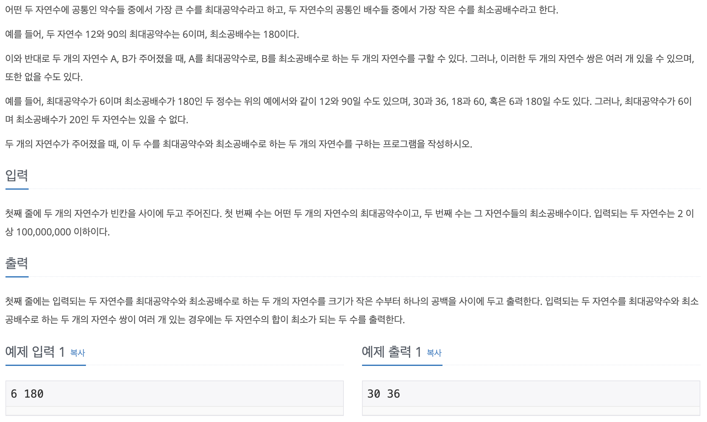 - 최대공약수와 최소공배수가 주어지면 두 수를 곱해 $x*y$를 구한다.