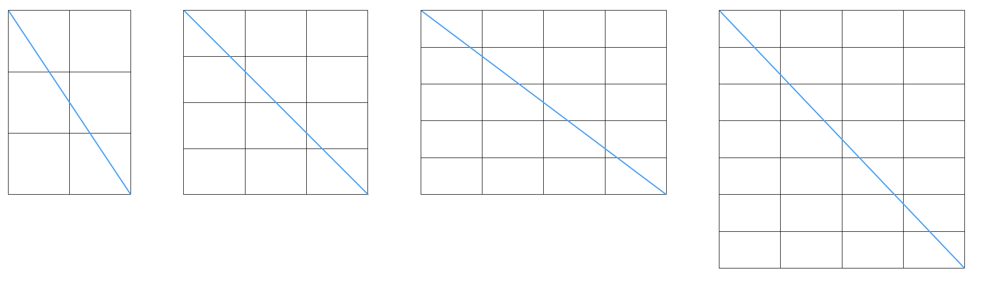 위의 그림을 통해 직사각형에 대각선을 그으면 $(x-1)$개의 세로줄, $(y-1)$개의 가로줄을 지난다는 것을 알 수 있다.