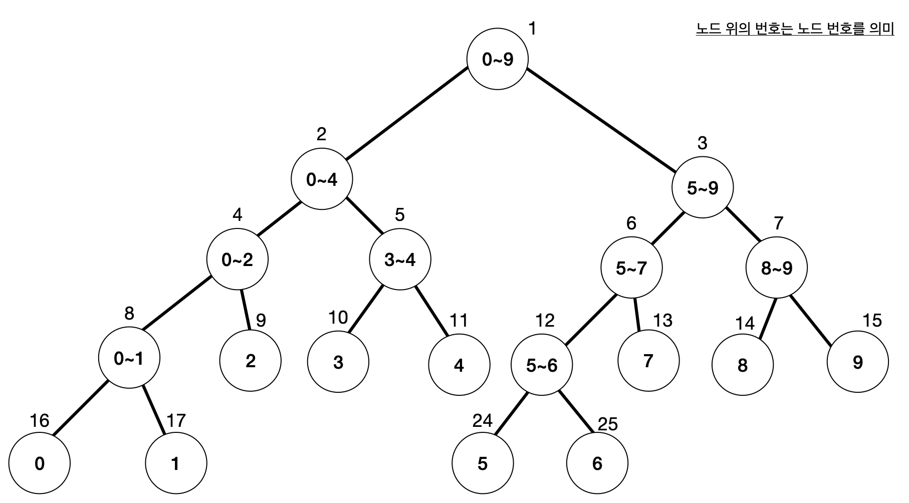 - Leaf 노드가 아닌 노드: 왼쪽 자식과 오른쪽 자식의 합 (구간의 합), 즉 구간에 대한 정보를 저장합니다.