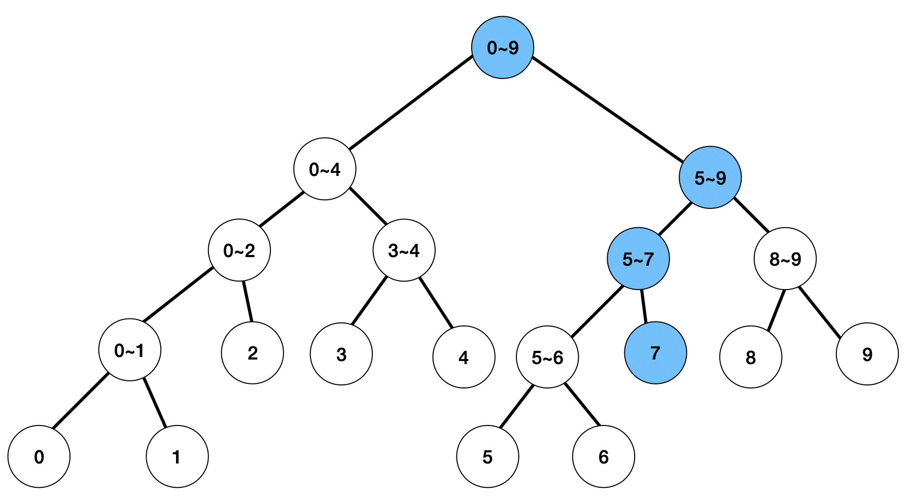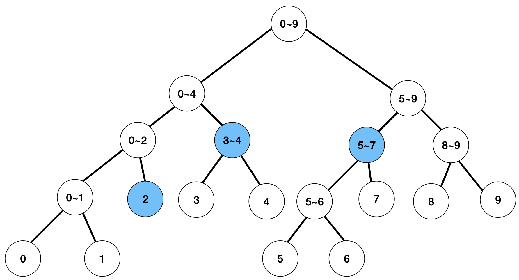 start ㅣ----------------ㅣ end - [left, right]와 [start, end] 구간이 겹쳐져 있는 경우 ---> 자식 노드로 탐색 진행