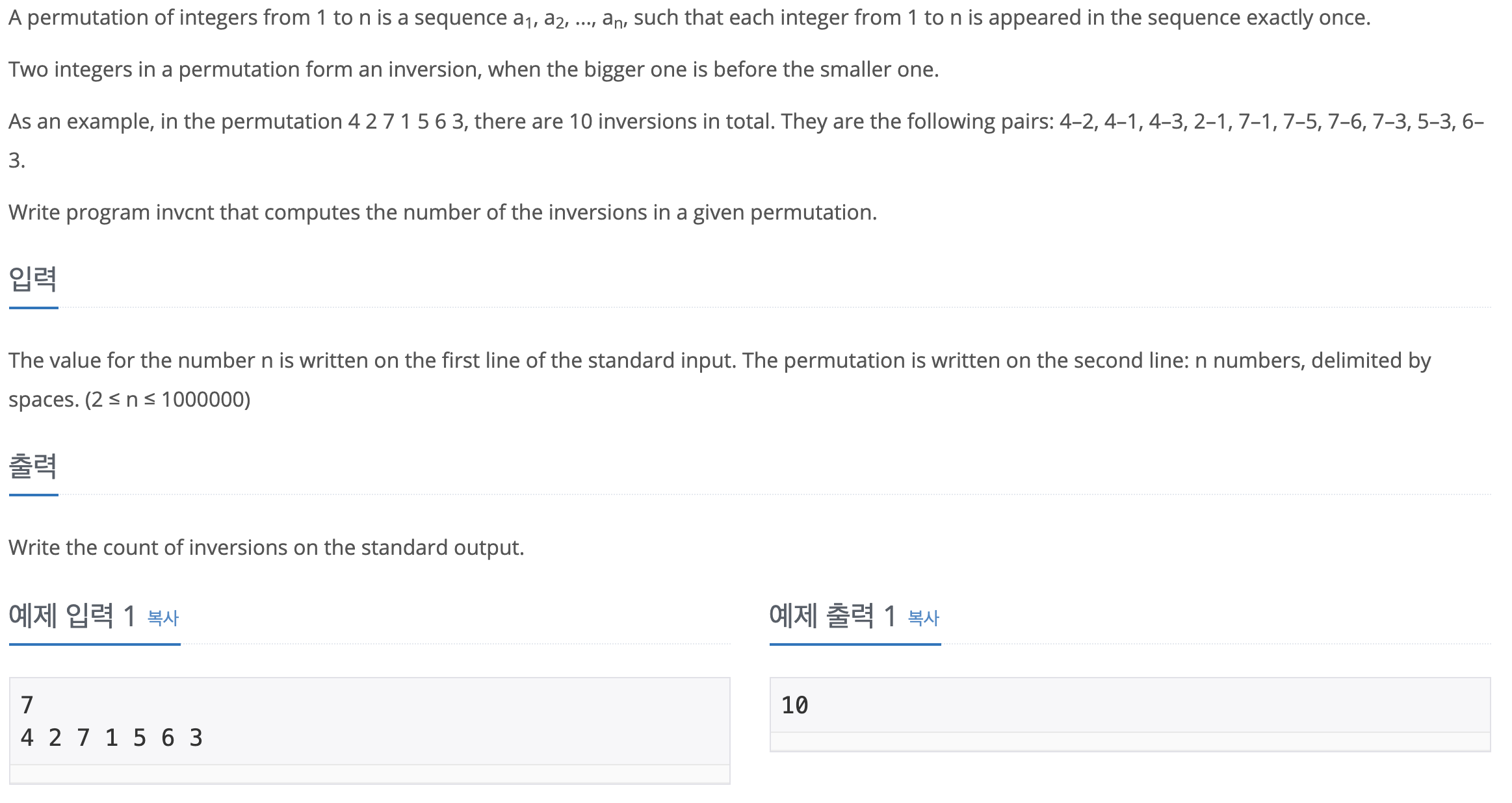Inversion 이란 $A[i]>A[j]$ (단 $i<j$)인 경우를 말한다. 즉, 수열이 오름차순이나 내림차순으로 되어있지 않고, 크기가 역전되어 있는 것을 말한다. Inversion 갯수를 세기 위해 단순 브루트 포스를 이용하면 $O(n^{2})$인데 반해, 세그먼트 트리를 이용하면 $O(nlogn)$으로 구할 수 있다.