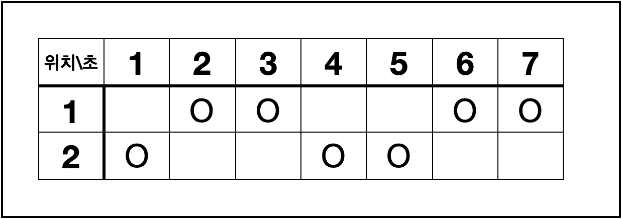 2. 1초에 2의 위치에 있을 경우 (이 경우 이동을 해야하기 때문에 현재 위치의 이동횟수-1 을 가진다)