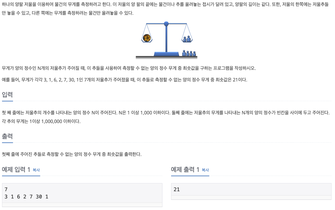 {1, 2} 가 있을 때 이 추들로 만들 수 있는 수는 각각의 수인 1과 2, 그리고 이 둘의 합인 3이 된다. 오름차순으로 정렬되어 있다는 가정 하에, 이것을 일반화해보면 첫 번째 원소인 1부터 ~ 1부터 마지막 원소까지의 합까지의 수는 만들 수 있는 수가 된다. 즉, 1부터 마지막 원소까지의 합 + 1한 수가 다음 원소로 나오지 않으면 그 수는 만들 수 없다는 얘기가 된다.