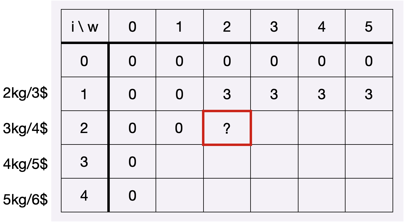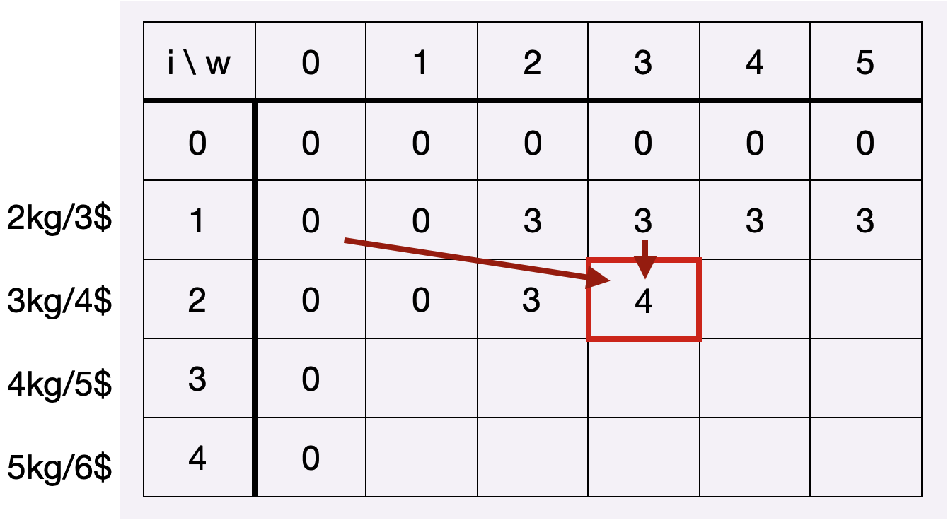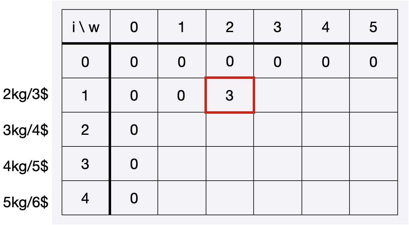 1. 배낭의 무게한도가 0kg일때 i-1번째 보석의 최적해 + i번째 보석의 가치 (i번째 보석의 무게가 3kg라 해당 칸의 무게한도-3kg해서 0kg)