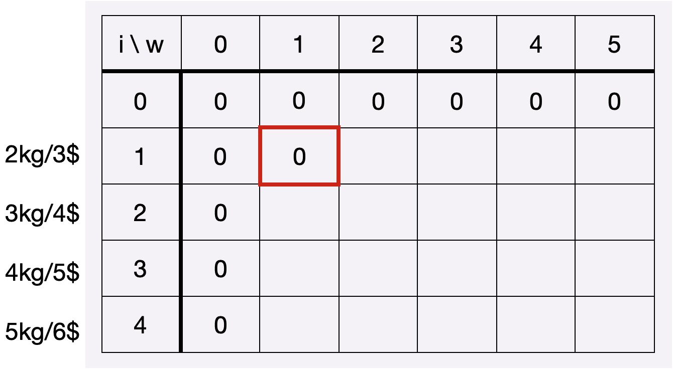 1번째 보석일때, 배낭의 무게한도가 1이라면 이 또한 보석을 담을 수 없기 때문에 0입니다. (1번째 보석의 무게는 2kg)