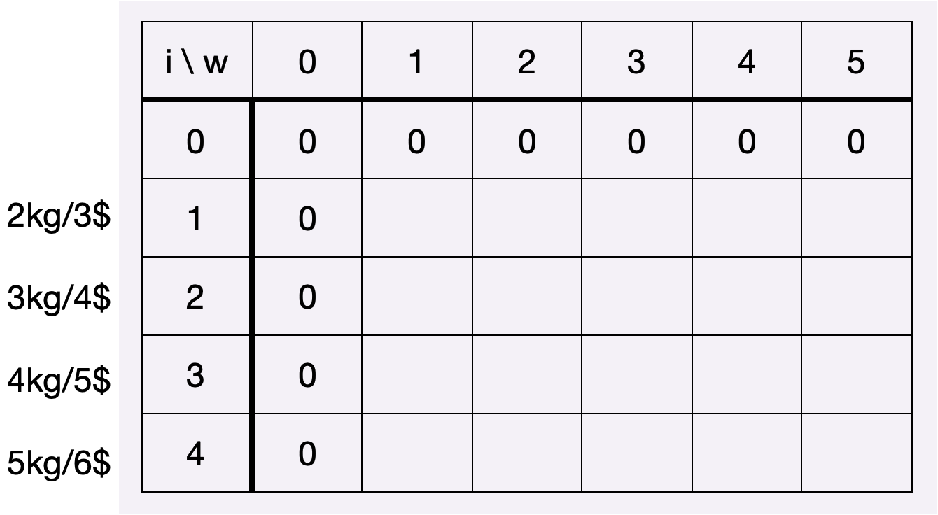 우선, 0번째 보석은 없고, 배낭의 무게한도가 0일때 아무런 보석도 담을 수 없으므로 1행과 1열은 모두 0입니다.