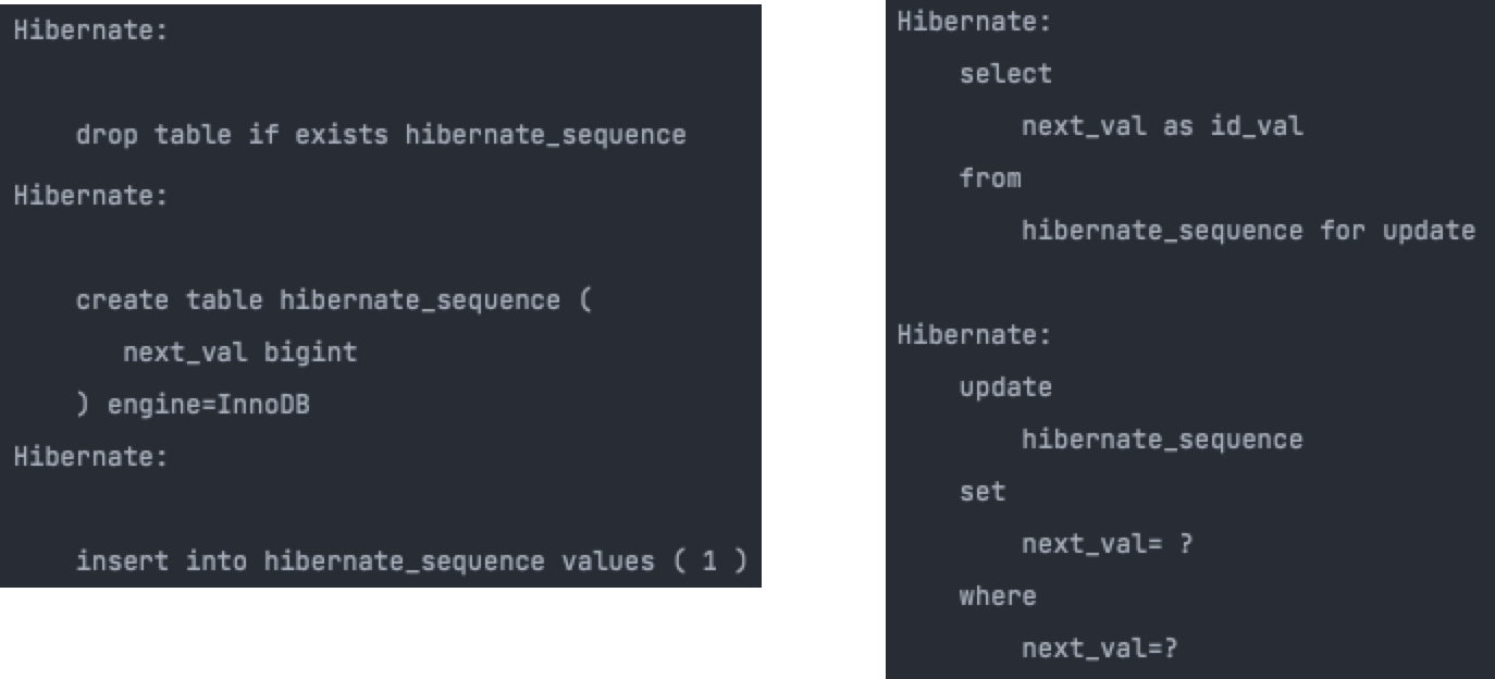 우측 그림은 JPA에서 INSERT를 할때 일어나는 동작으로 generator를 조회해서 id 값을 애플리케이션 내에서 세팅합니다. 그리고 UPDATE문을 통해 다음 키 값이 될 값으로 업데이트해주고 있습니다.