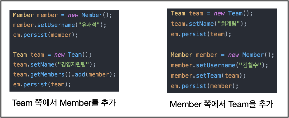 좌측은 Team 객체를 중심으로 Member를 추가하고, 우측은 Member 객체를 중심으로 Team을 설정합니다.