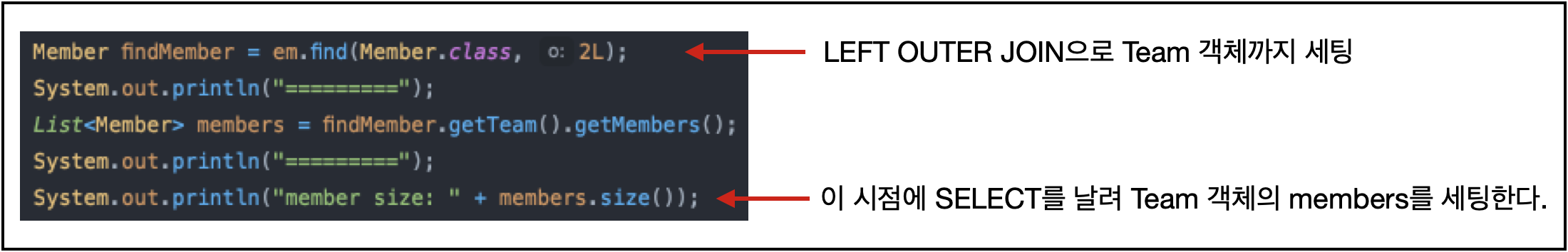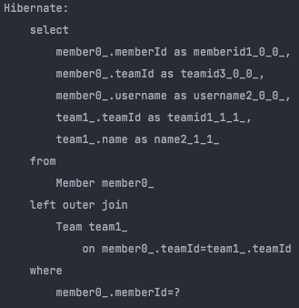 위와 같이 .find() 로 Member를 가져오면 다음과 같이 LEFT OUTER JOIN 을 통해 Team 객체를 세팅합니다.
