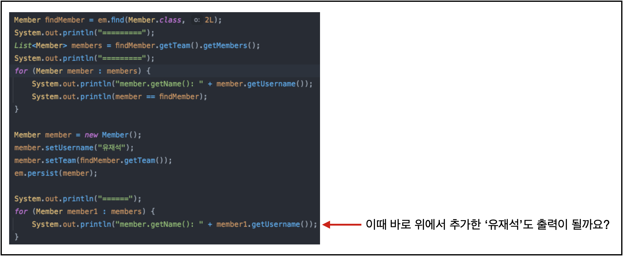 안타깝게도 저 경우 '유재석' 이란 데이터가 출력되지 못 합니다. (JPA가 저렇게 추가되는 데이터 하나하나를 다 확인 할 수는 없나봅니다..)