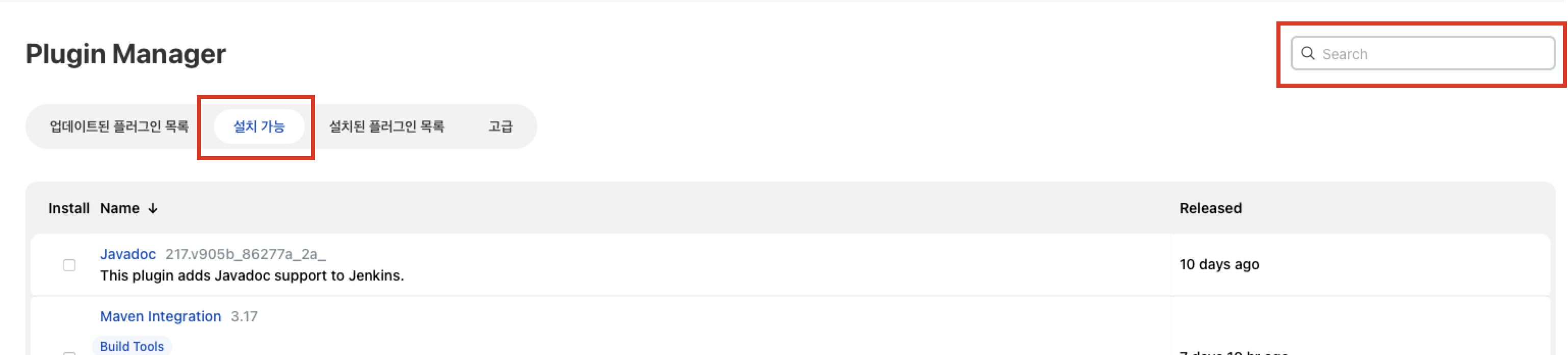 그 후, [설치 가능] 탭을 눌러 검색 창에 설치해야할 플러그인을 하나씩 검색하여 설치합니다.