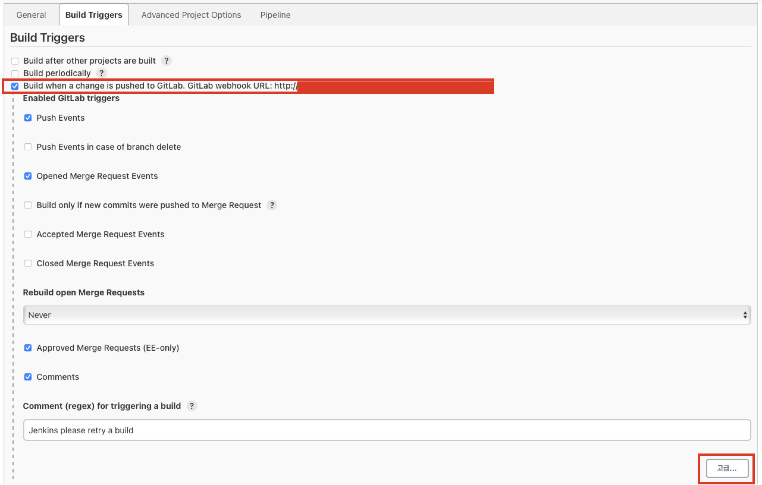 'Build when a change is pushed to Gitlab. ~' 부분을 체크해주고, 아래의 '고급' 버튼을 누르면 'Generate' 라는 버튼이 생깁니다. 해당 버튼을 누르면 Secret token 값이 생성되는데, 이 Webhook URL과 Secret token 값을 기억해둡니다!