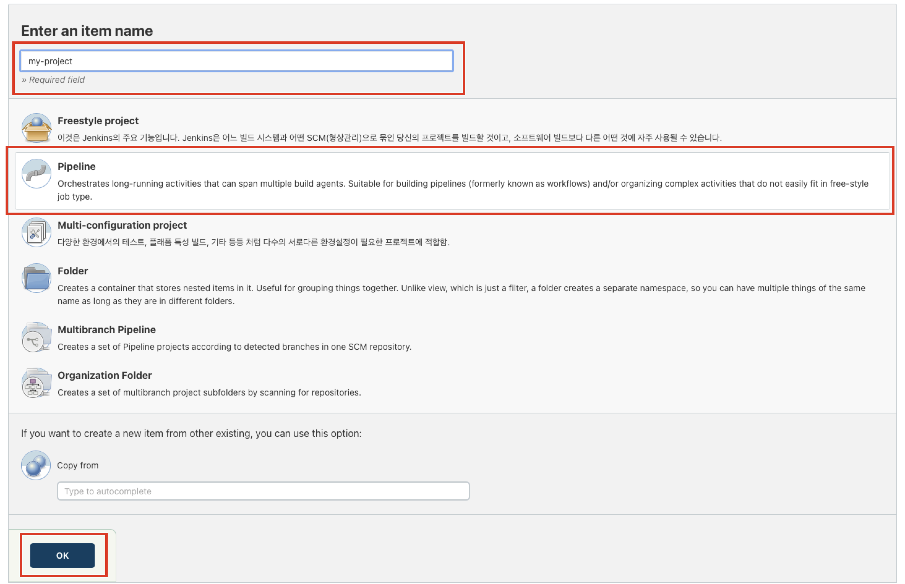 그럼 아래와 같은 화면이 나올텐데, 다음과 같이 Pipeline을 선택하고, 아이템명을 입력한 후 다음으로 넘어갑니다.