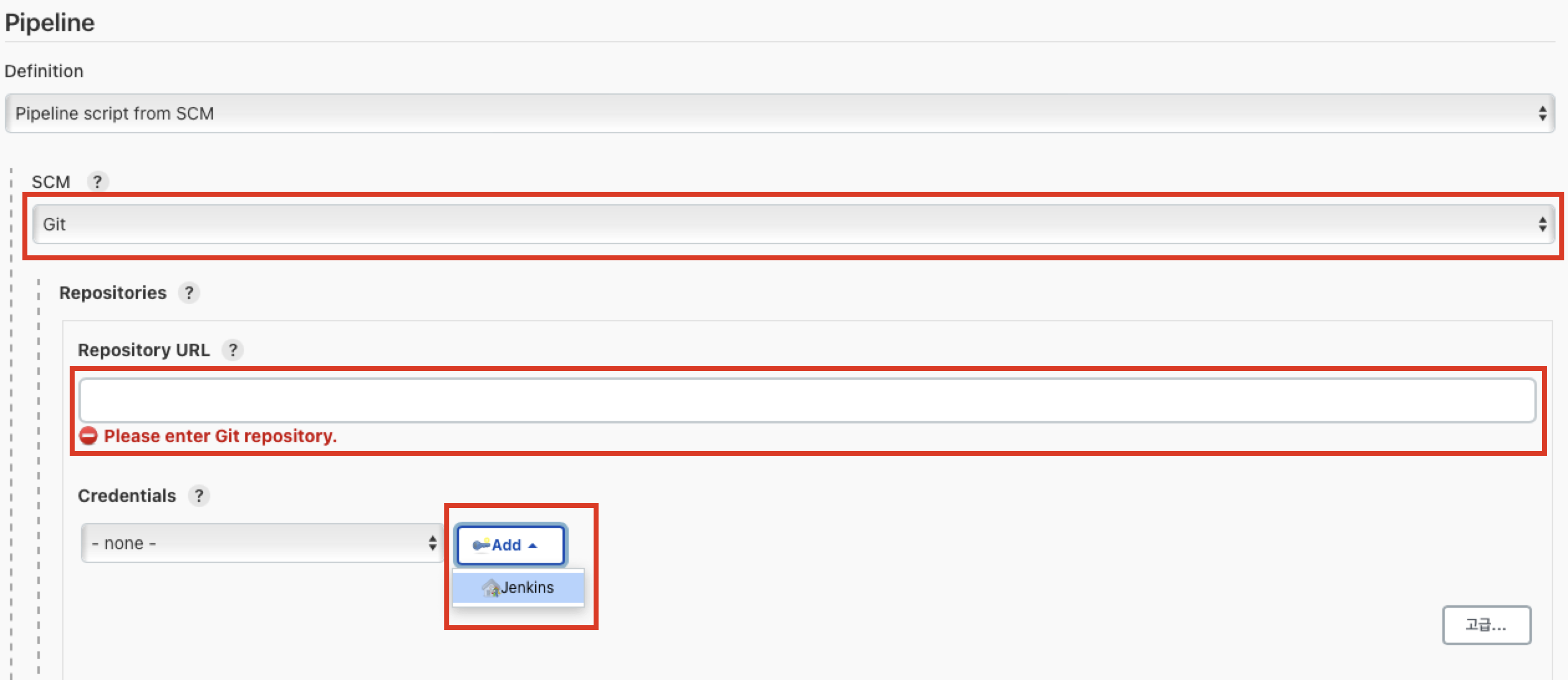 Jenkinsfile로 CI/CD 스크립트를 관리하는게 유지보수 측면에서 훨씬 더 좋기 때문에 'Pipeline script from SCM' 을 선택합니다.