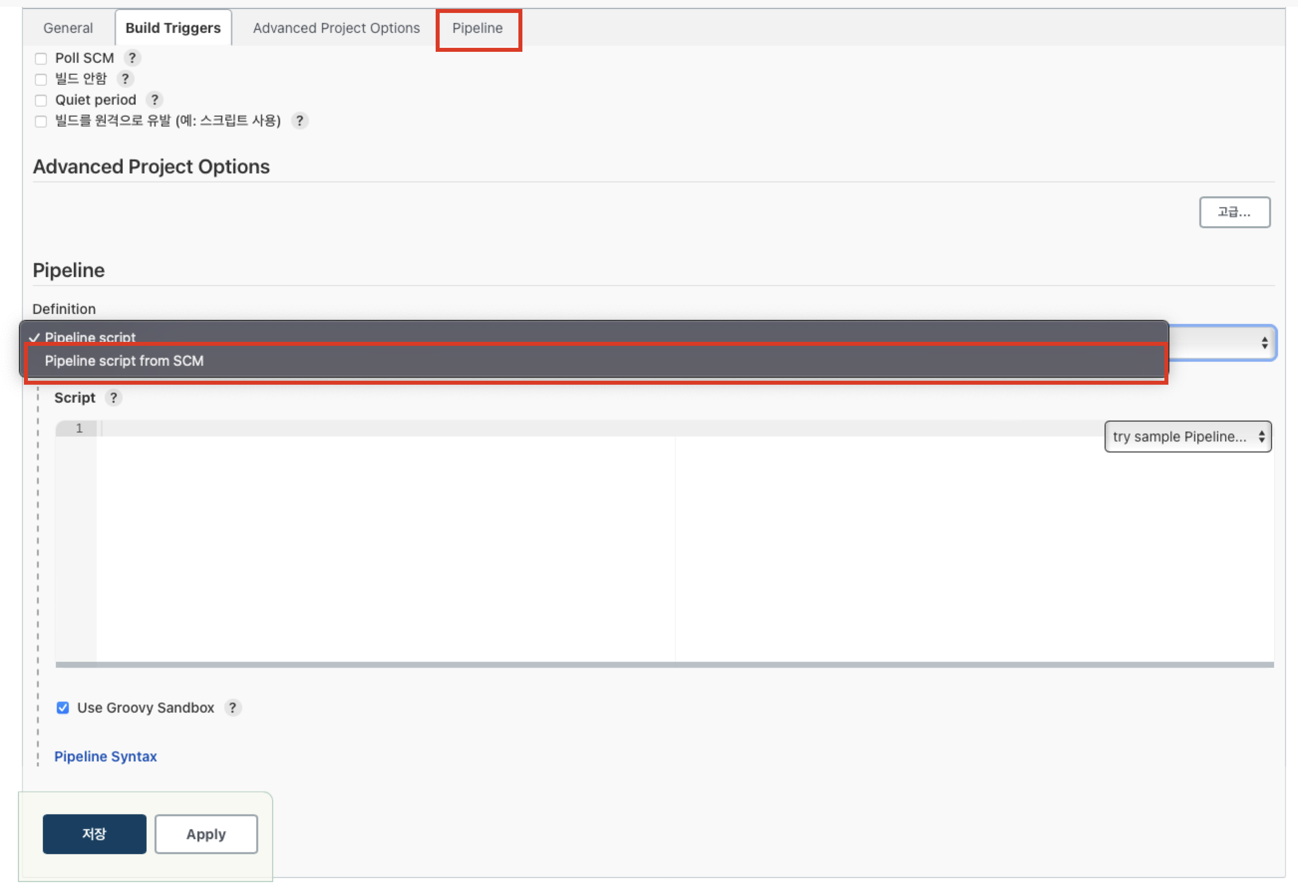 Jenkins의 Pipeline 스크립트를 아래 에디터에 바로 작성할 수도 있고, Gitlab의 Jenkinsfile로 부터 가져올 수도 있습니다.
