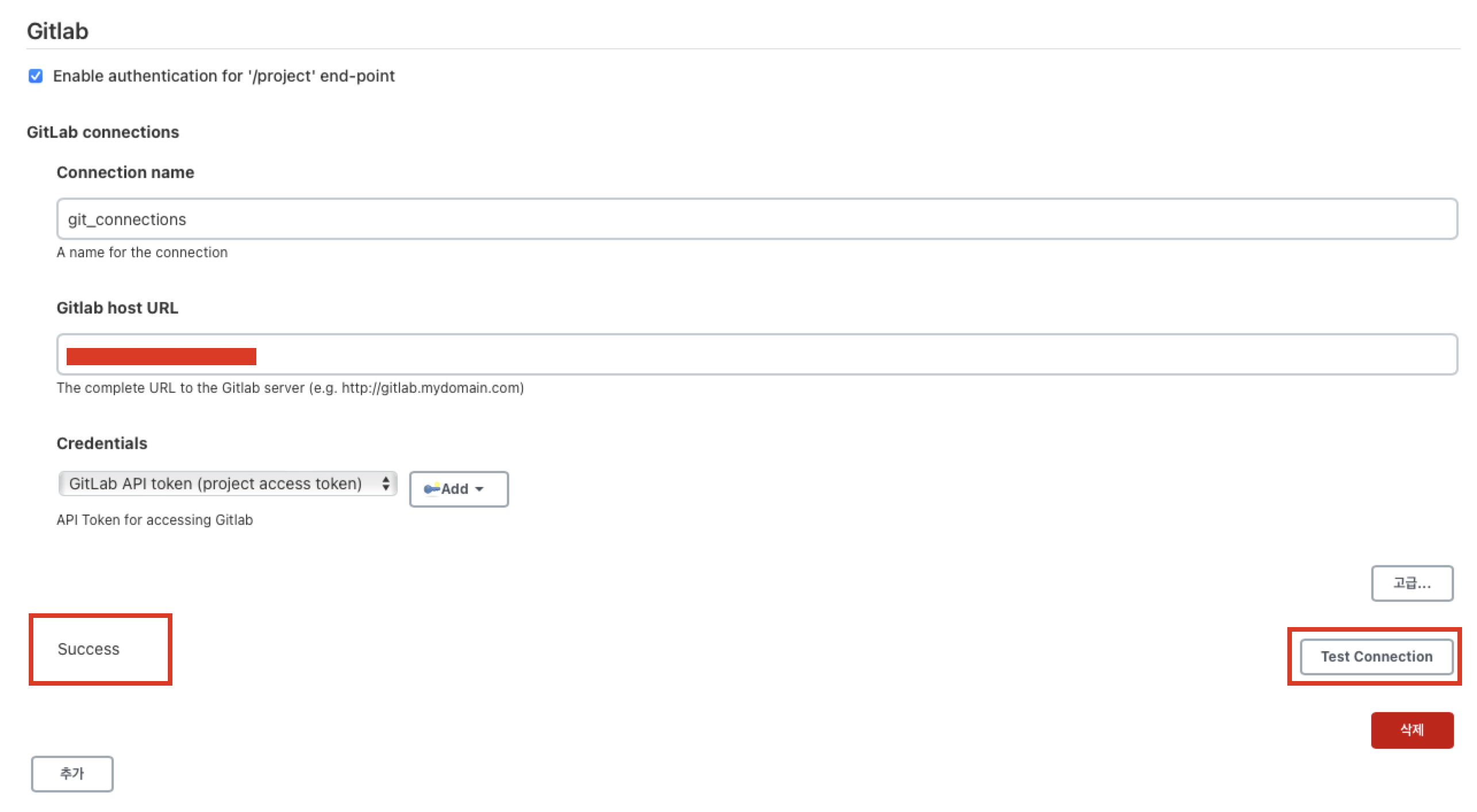 그 후, 'Test Connection' 을 누르면 다음과 같이 'Success' 가 나옵니다. (Credentials 생성은 아래에서 설명합니다.)