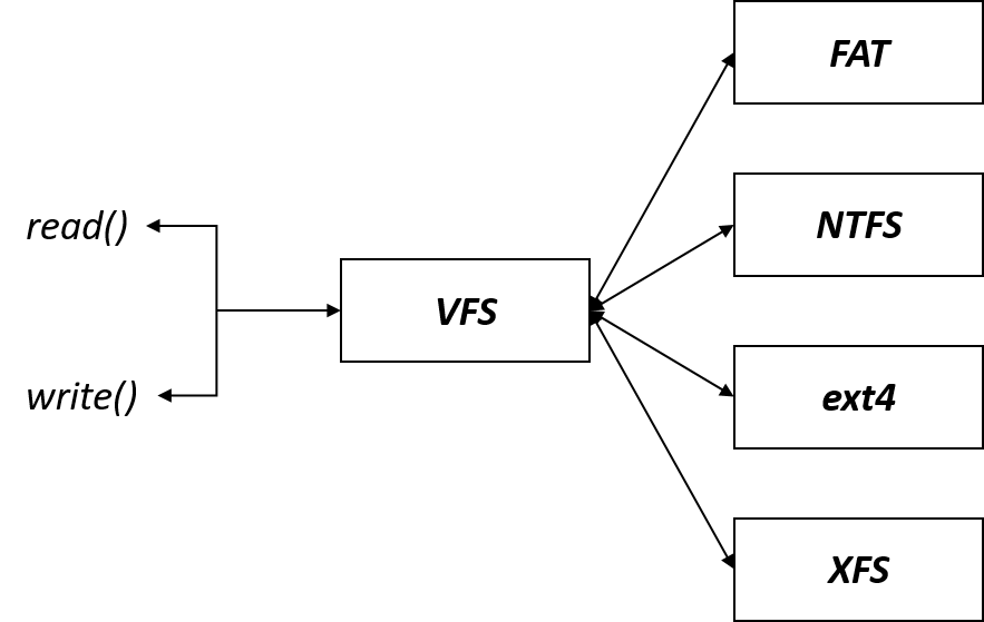 프로그래밍을 하다보면 빠지지 않는 것이 파일 처리인데요, 혹시 파일 작업을 하기 위해 read(), write()와 같은 시스템콜을 사용하면서 "왜 매개변수로 어떤 파일 시스템인지 넘겨주지않지?"라고 생각해보신적 있으신가요? 사실 조금만 생각해보면 답이 금방나오는 질문입니다. 이유는 파일 시스템이 추상화되어있기 때문입니다. 구조를 표현하면 다음 그림과 같습니다.