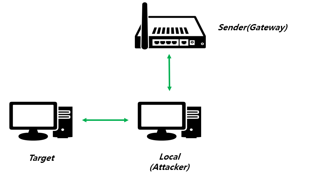 ARP Spoofing은 로컬 랜에서의 패킷 경로를 조작하는 공격입니다. 공격 구도는 다음 그림과 같습니다.