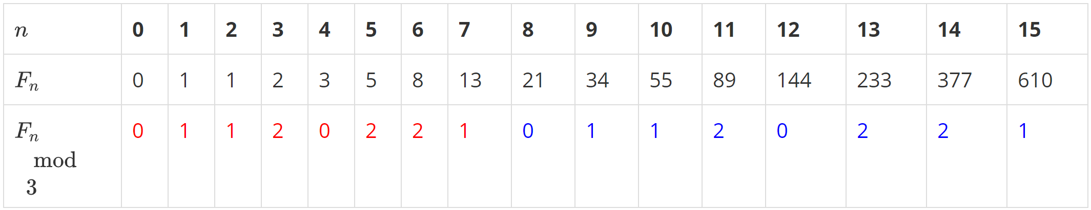 피보나치 수를 3으로 나누었을 때 주기는 8이 된다.