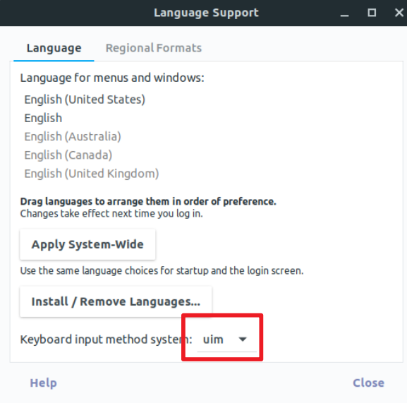 Keyboard input method가 IBus로 설정되어있을텐데, uim으로 바꿔줍니다.