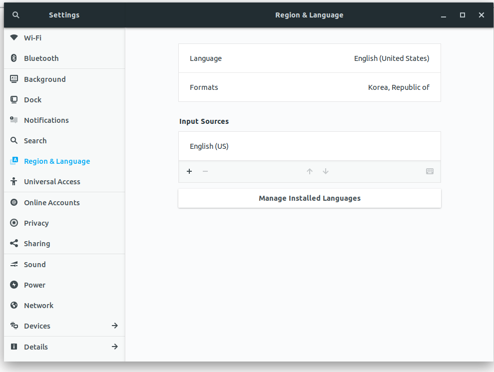 아래 그림의 Input Sources에서 English 하나만 남기고 지웁니다.(만약 저처럼 한글을 추가해주신 분이라면)