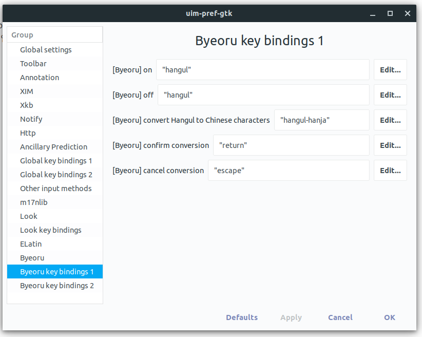 그리고 마지막으로 벼루 키 바인딩 설정입니다. 한영변환 키로 설정하면 되는데 처음에 키 바인딩 인식을 하지 못할 겁니다. 추가적으로 아래의 설정을 같이 해주면 정상적으로 한글 입력이 작동됩니다.